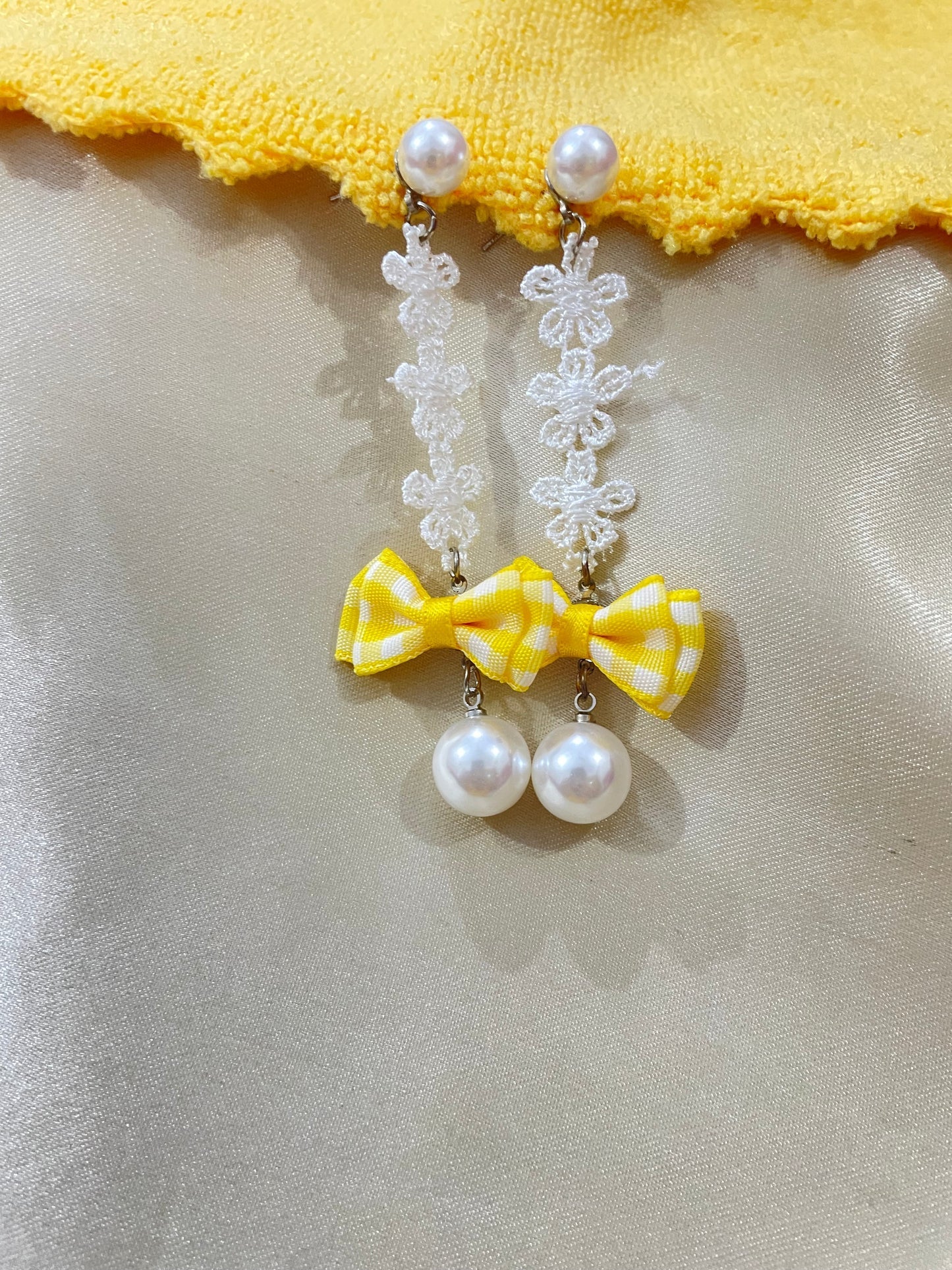 Alamod fasion filigree earring with pearl ball and white and yellow cloth stuff
