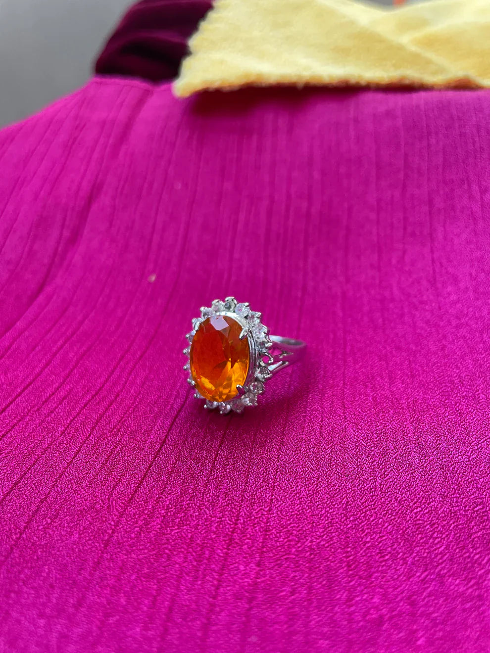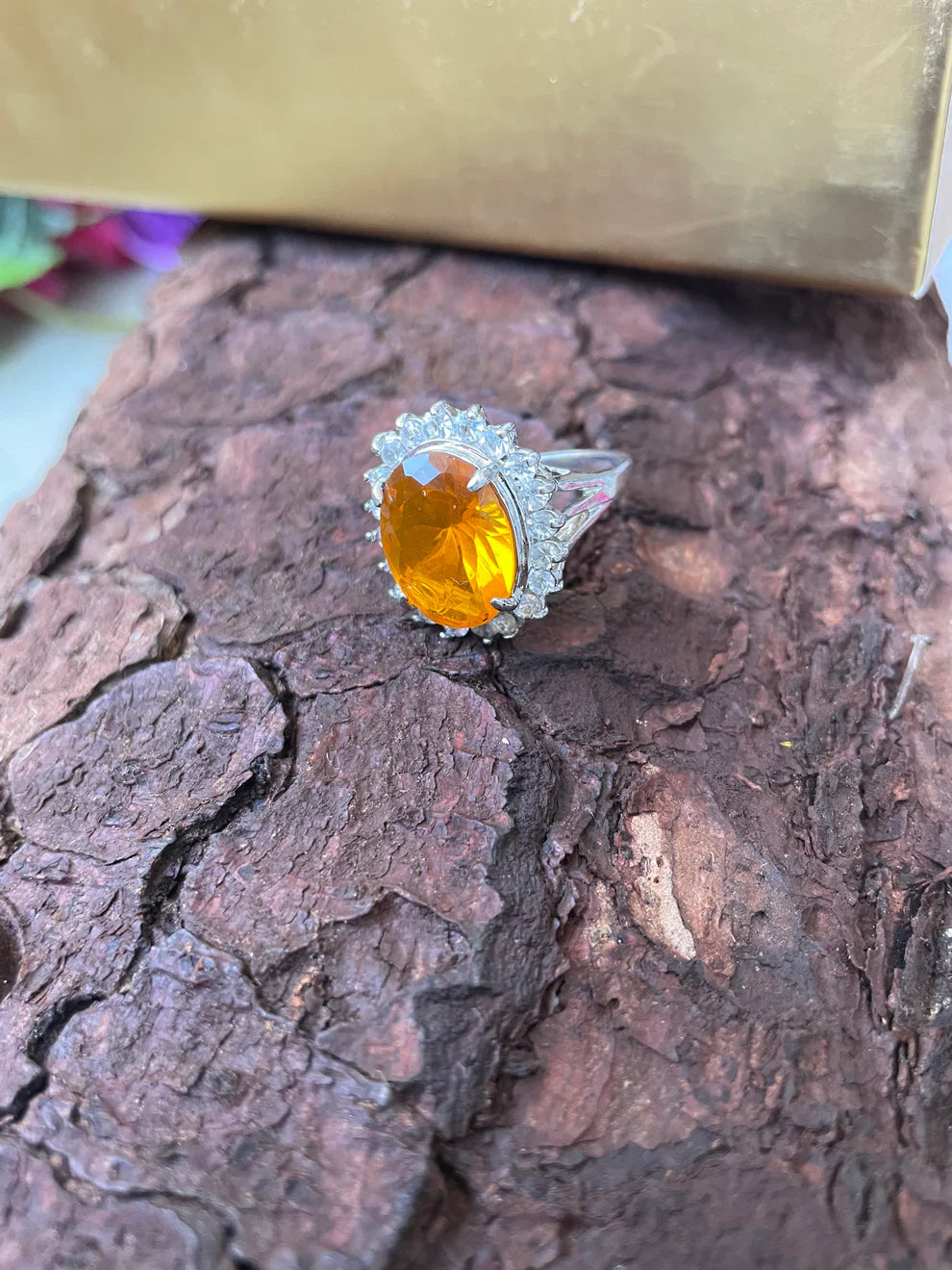 Oval sunset citrine stone cocktail design silver ring